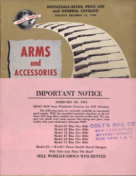 1951 Winchester Wholesale-Retail Price List and General Catalog dated at the top of the cover "December 15,1950".It measures 8-1/2" x 10-3/4" with 59 numbered pages.The full line of Winchester firearms with illustrations,complete descriptions with specs and options available.There are 2 pages of Model 21 engraving available,the 10 gauge cannon,recoil pads and gun cleaning products also.The pink paper over wrap is held by the spine staple and is dated "February 20,1951".This catalog apparently was in the files of the Colt's Mfg.Co.,New York office.The code on the back cover is "FORM NO. 2048".The catalog under the pink over wrap also has the Colt's Mfg.Co. imprint. Excellent condition with a very small bump at the bottom of the back cover